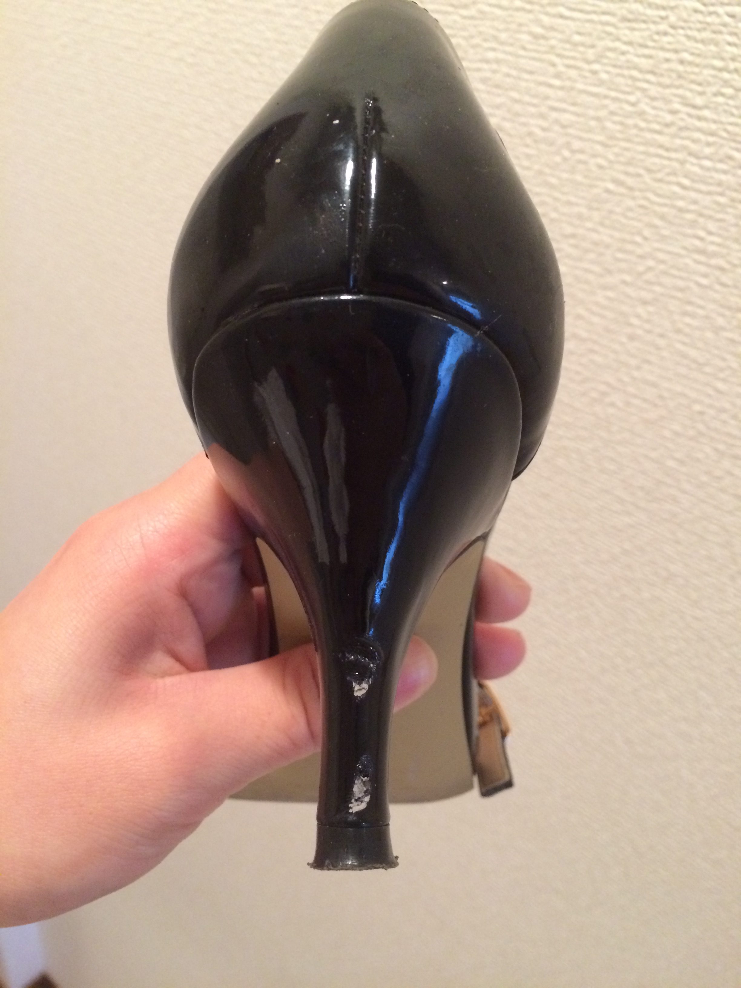 表面がエナメル加工されたピンヒールのかかと部分です。どこかにぶつけてしまったようで、表面がぺろっとめくれてしまっています。